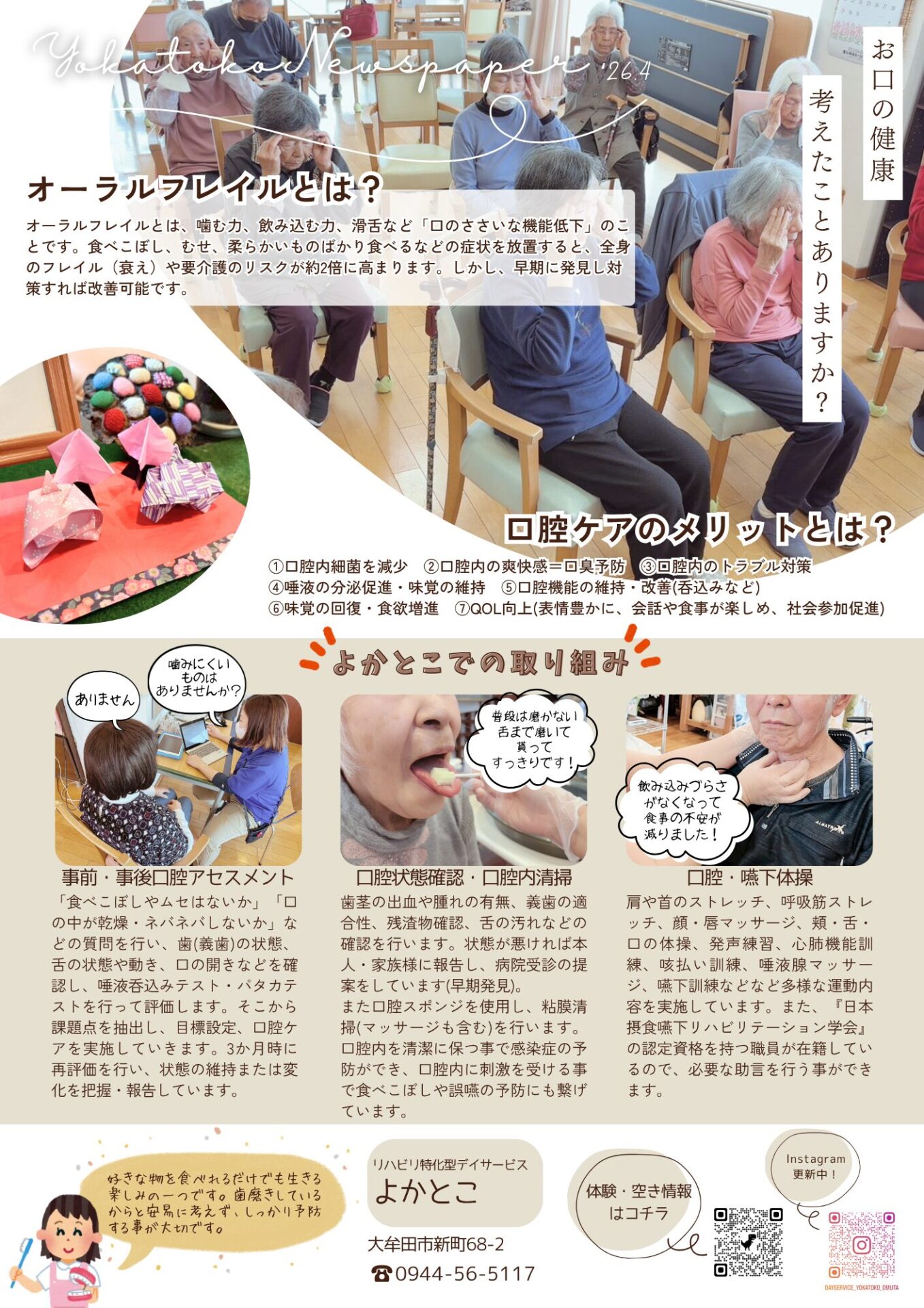 平成30年7月より口腔機能の総合評価システム(Oral care plus)を導入し、口腔機能の評価・ケアを実施しています。お口の健康は健康寿命にも大きく関係しており、人との交流や会話、しっかりとした食事を取ることで活き活きとした生活を送れるよう支援していきます。またご家族でも口腔内や義歯の管理までは目の行き届かない事が多く大変喜ばれています。